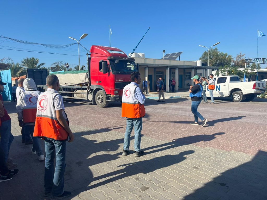 Lastbilar kör in på Gazaremsan från Egypten. Foto: Palestine Red Crescent Society