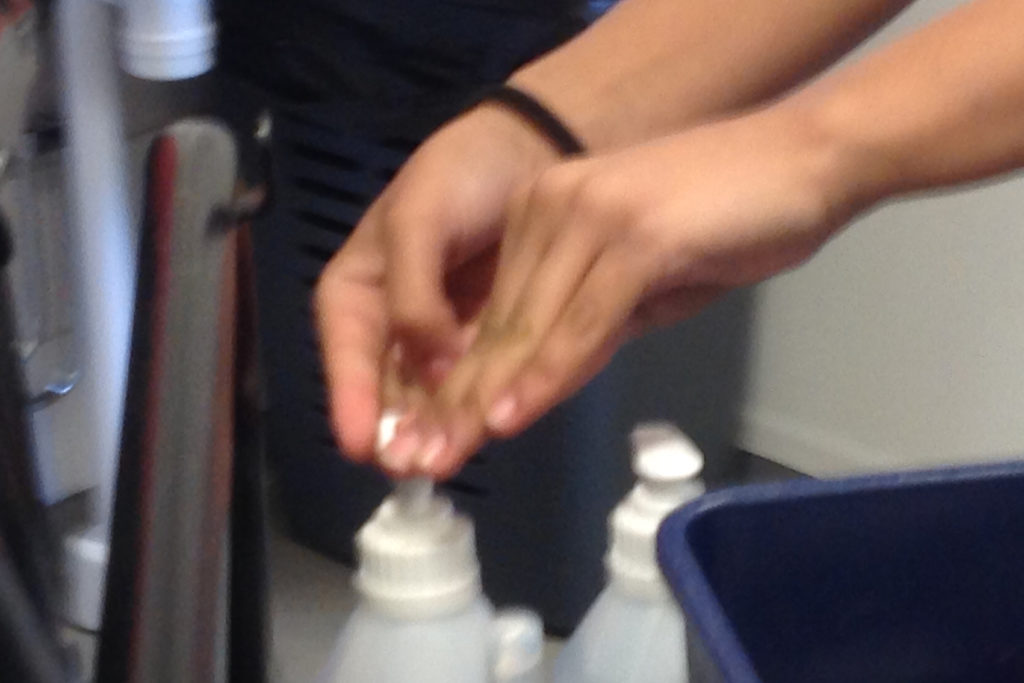 Vi måste hålla avstånd i matsalen när vi står i kö eller när vi sitter. Vi måste använda handsprit.